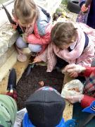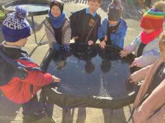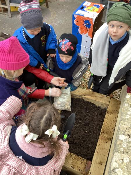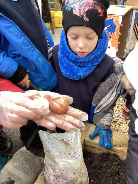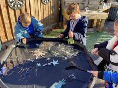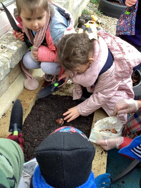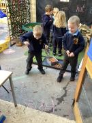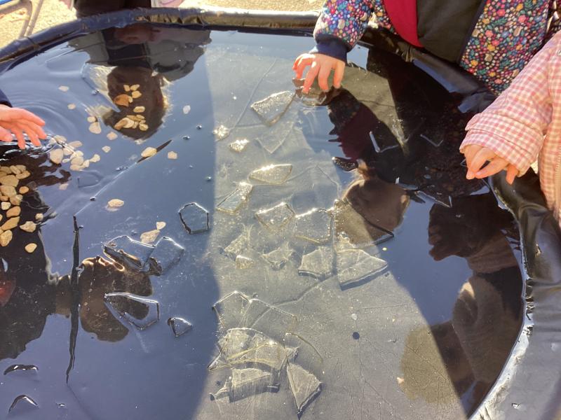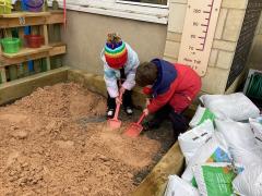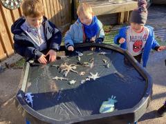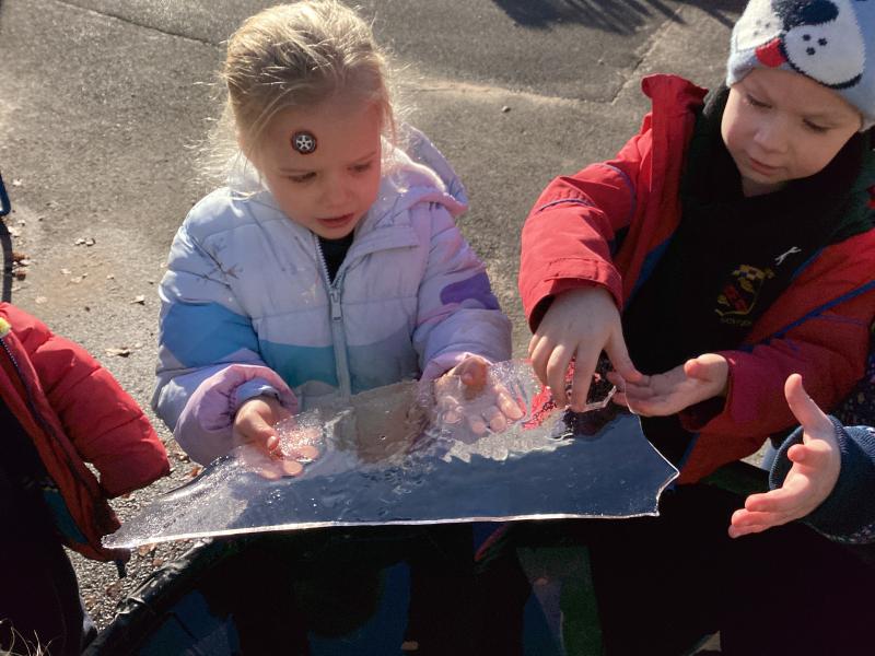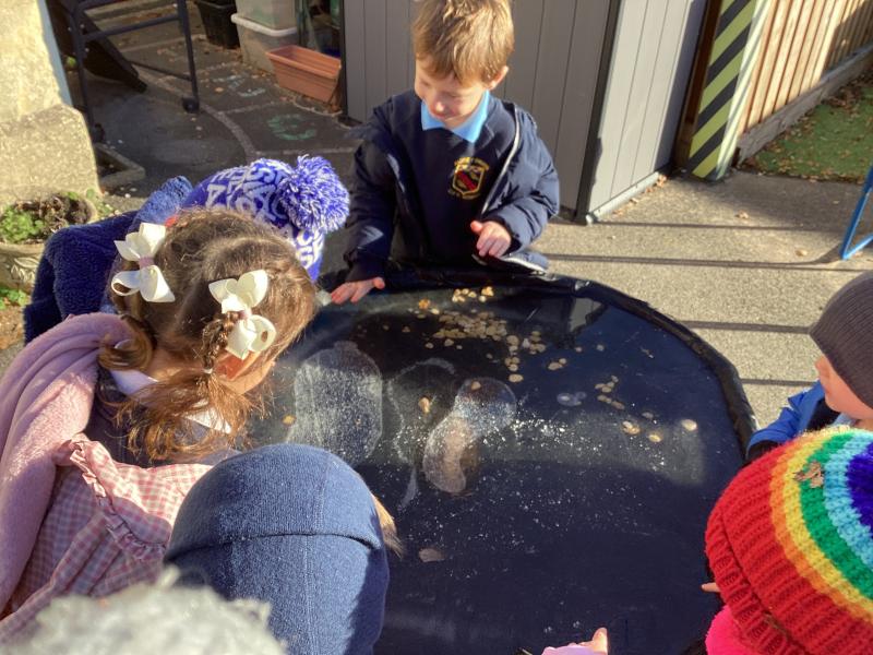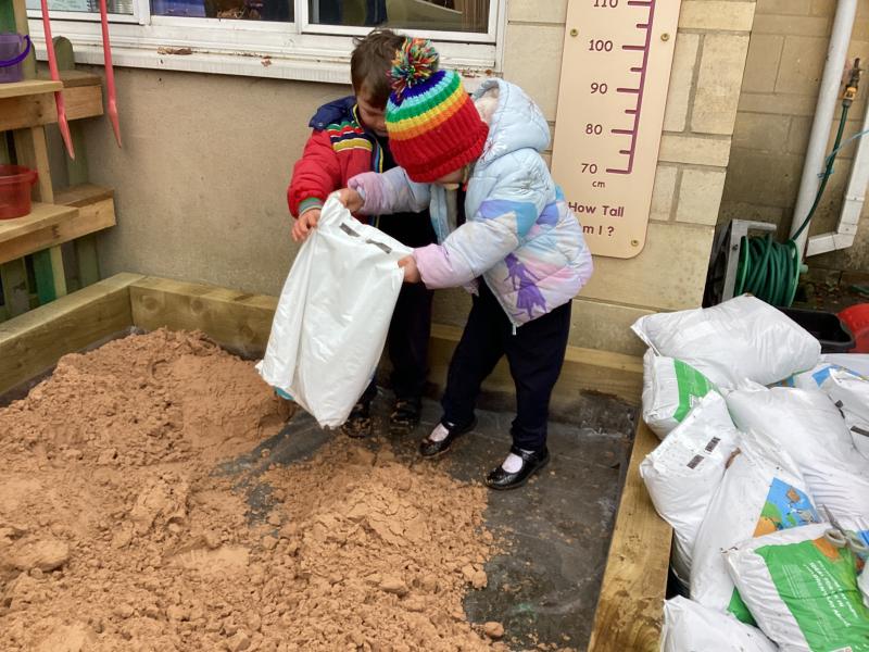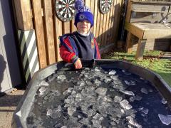 On Thursday afternoon we decided to plant some of the 300 bulbs that we had delivered last week into the lovely planter that was made by some volunteers in the summer. We cannot wait to see what colours the flowers are when they grow. We planted some tulips and crocuses. We also filled up our amazing sandpit that was also made in the summer – it took over 30 bags of sand! We are looking forward to it warming up a bit to make full use of it! Most children found it too cold to explore outside much this week, and chose to stay warm inside with the fire glowing on the whiteboard listing to piano music! Those of us who did venture outside were intrigued by the ice in the water tray and enjoyed discovering how to break the ice and release the sea creatures that had been frozen inside!