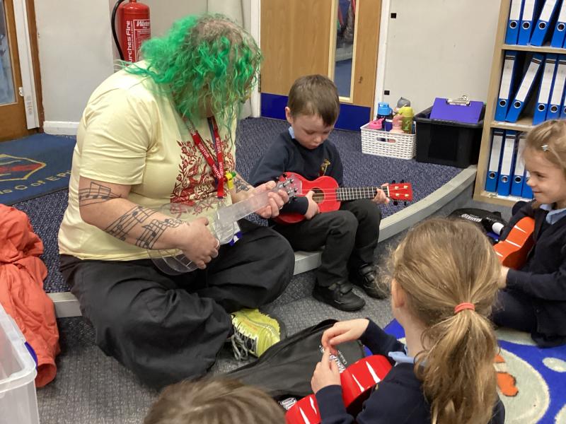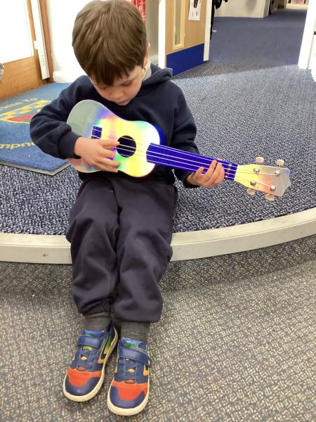 We have our second ukulele lesson this week. We had to press our middle fingers onto the blue dot on the C string to play D.