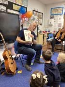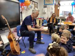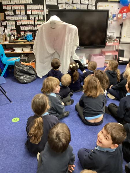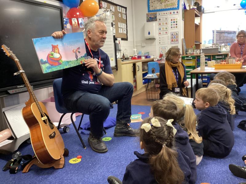 On Tuesday we had the Ampney Crucis Literature Festival (please listen to Cotswold Radio between 3pm-4pm on Sunday 1st February to hear the Ampney Crucis School Literature Festival Interviews). We have been so lucky to meet some authors this week who did some amazing work with us. We met Sally Grindley who read us ‘Shhh!!!’. We have to ben really quiet when Sally read this book as we didn’t want to wake the giant. We had a big surprise when we saw the giant’s eye had opened” We loved seeing all the characters in ‘Knock, Knock Who’s There’. We also met John Daugherty and loved listening to his funny poems! He read us two books called ‘There’s a Pig Up My Nose!’ and ‘The Hare Shaped Hole’. Click here to find out what the story is about by John himself. John also sang some songs and played his guitar.