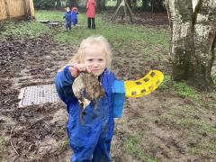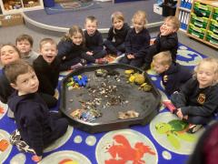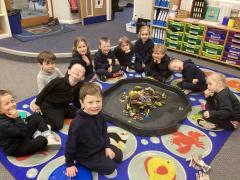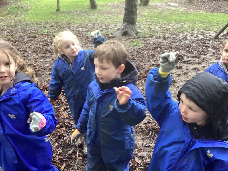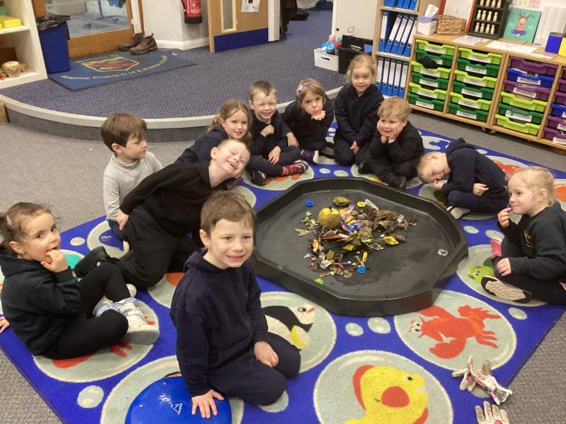 In Forest School this week we popped on our wellies and waterproofs and braved the rain! We read the story Litterbug Doug by Ellie Bethel, and thought about the importance of putting rubbish in the bin and not throwing it on the floor. We then went on a litter pick around the school and within no time we had collected a bag full of rubbish. We then returned to the classroom and put it on a tuff tray and read the story Michael Recycle by Ellie Bethel, and sorted the rubbish into items we could recycle.