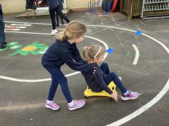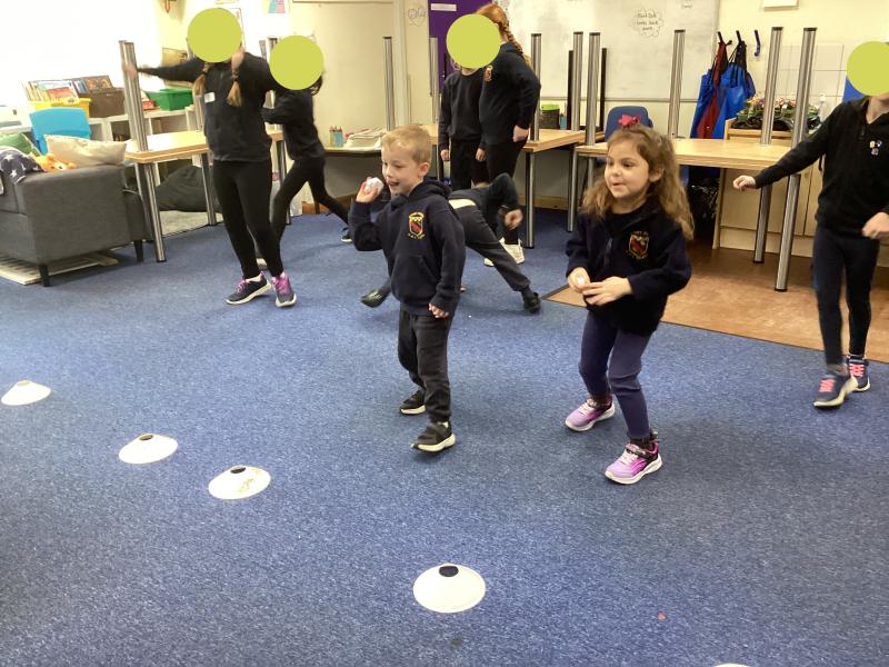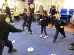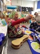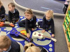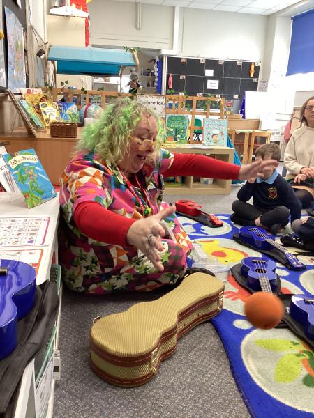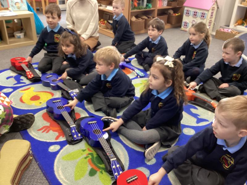 In our ukulele lessons this week we learnt how to play the 'c' chord and we had to press down the red spots on our instruments. Leigh played a game with a ball - everytime it bounced we had to play D or C.
