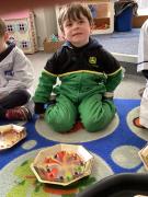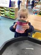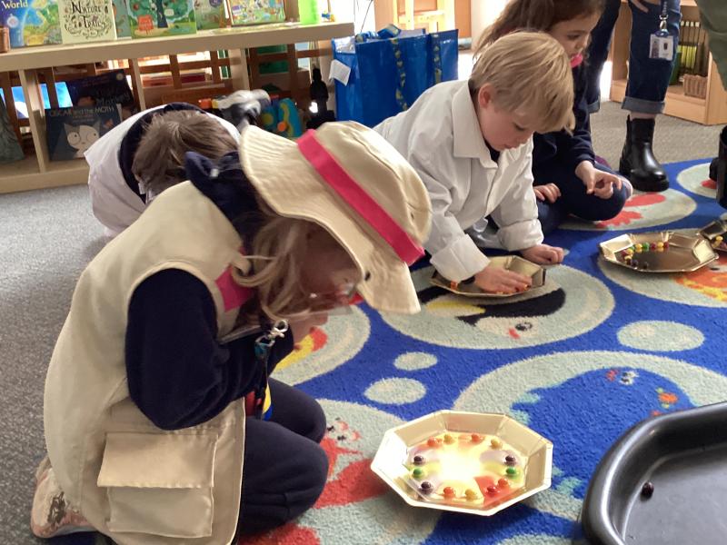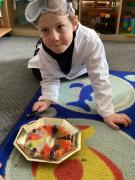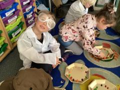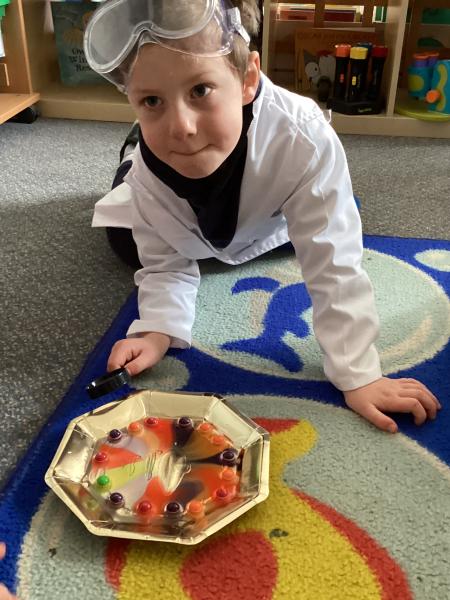 Upon returning to school we dressed as scientists and enjoyed a scientific workshop with Miss Jackson where we discovered how raisins can dance in water, and explored colour mixing with skittles.